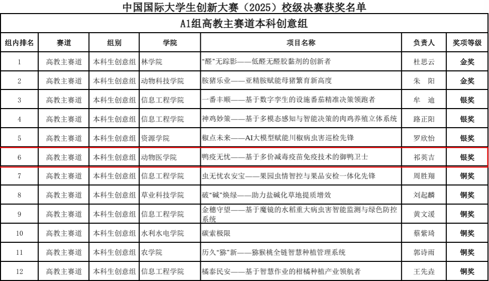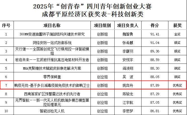 由共青团四川省委等11部门联合主办,2025年“创青春”四川青年创新创业大赛成都平原经济区决赛中,公司项目《鸭疫无忧——基于多价减毒活疫苗免疫技术的“御”鸭卫士》获科技创新类优秀奖。