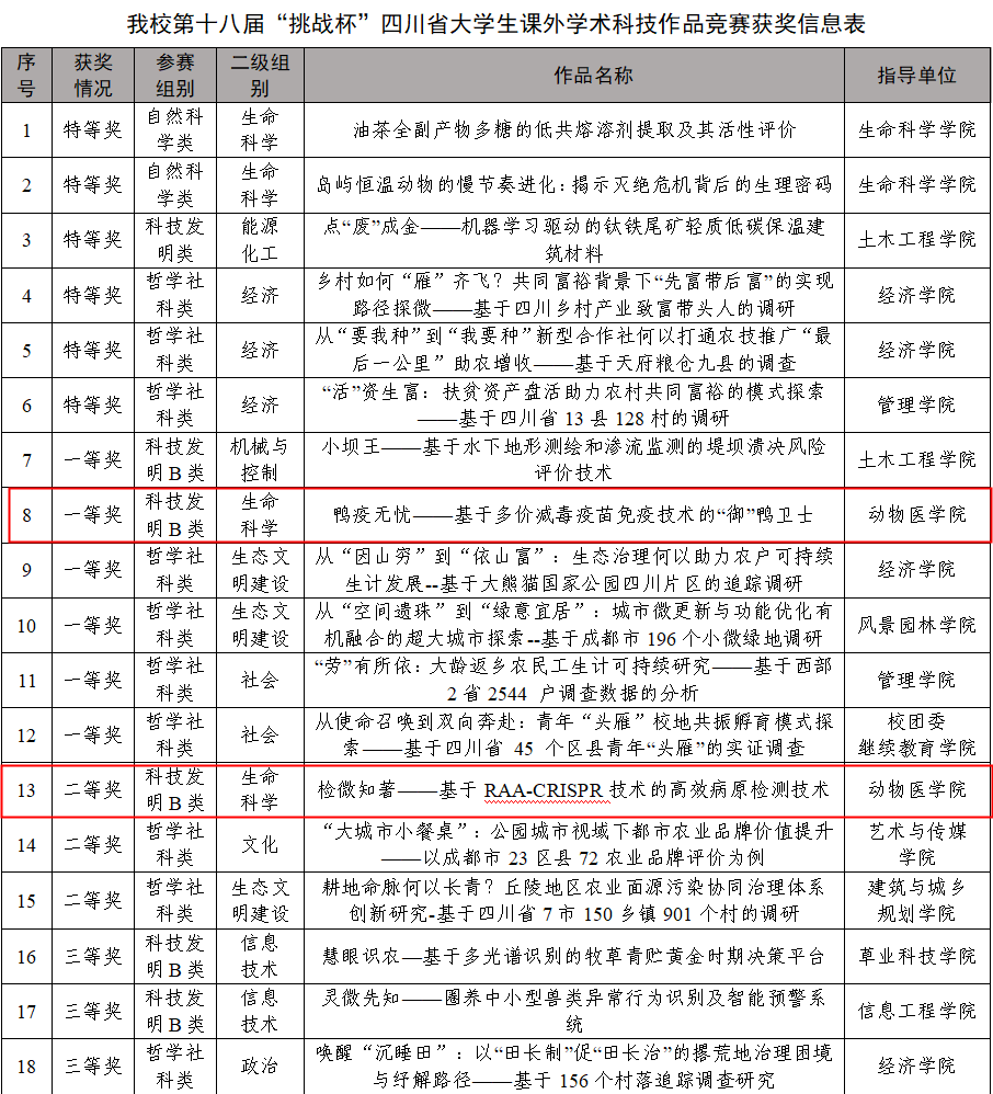 由共青团四川省委联合省委组织部、教育厅、科技厅、人力资源社会保障厅、省科协、省社科院、省学联等单位共同主办,第十八届“挑战杯”四川省老员工课外学术科技作品竞赛中,公司两项作品脱颖而出:《鸭疫无忧——基于多价减毒活疫苗免疫技术的“御”鸭卫士》荣获一等奖,《检微知著——基于RAA-CRISPR技术的高效病原检测方法》获得二等奖。