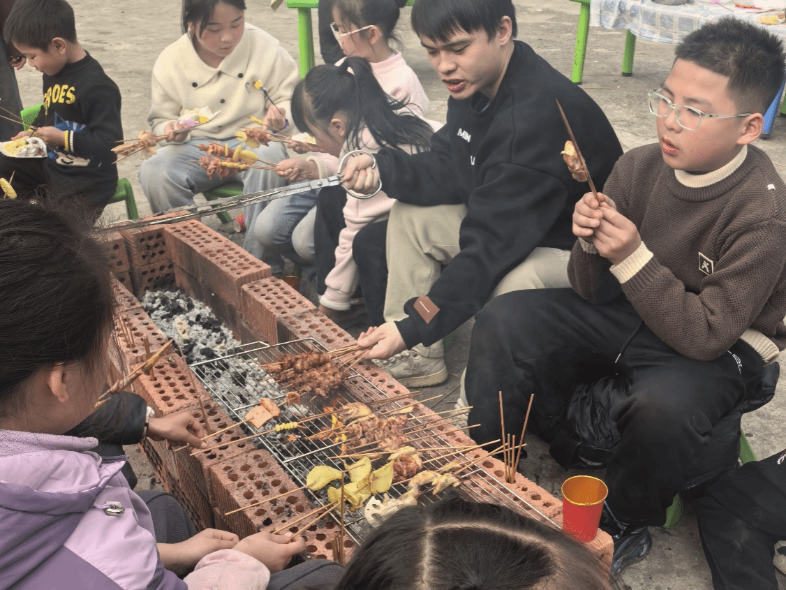 实践收官阶段,团队将课堂延伸至更广阔的天地。2月25日,孩子们体验了灌制香肠并到集市售卖。从最初的羞涩到勇敢开口推销,他们在真实的成功与挫折中学会了面对挑战、锤炼勇气。2月26日,队员们带领孩子们徒步郊野、采摘水果、合作制作竹筒饭。在拾柴生火、耐心等待美食出炉的过程中,孩子们不仅感受到了自然的馈赠与合作的快乐,更在身体力行的劳作中实现了身心的成长,为实践周画上了圆满的句号。