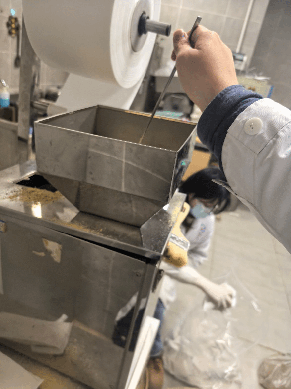 图为:张紫怡检验操作现场、唐浩瀚炮制药材