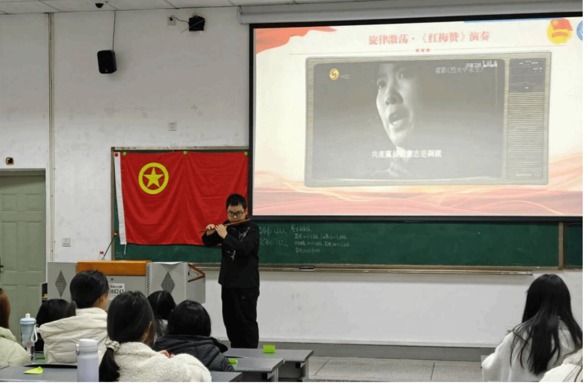 随后,各小班代表依次分享抗日救亡主题电子海报的创作思路,结合历史背景阐释作品中的爱国主义内涵;民乐团优秀乐手杨永九现场演绎《江姐》相关红色经典曲目,悠扬旋律唤起全场共鸣,学子们伴随节奏高声跟唱,红色基因在歌声中代代相传。