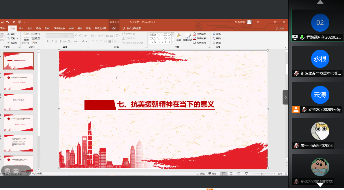 仰英华,百世流芳。12月24日下午16:30—18:00,由动医20-2、动医20-3、药学20-2以及药剂20-1支部组成的第二小组以心得分享形式带领全体参会同学领略了抗美援朝战争中那些中国英雄的乐观主义精神和顽强的民族意志以及无畏的英雄风采。随着豪迈的歌曲响起,杨根思等英雄将士的故事一幕幕上演。天地英雄气,千秋尚凛然。前瞻机遇,后望先辈,他们,就是书写在历史长卷上最可爱的人们。