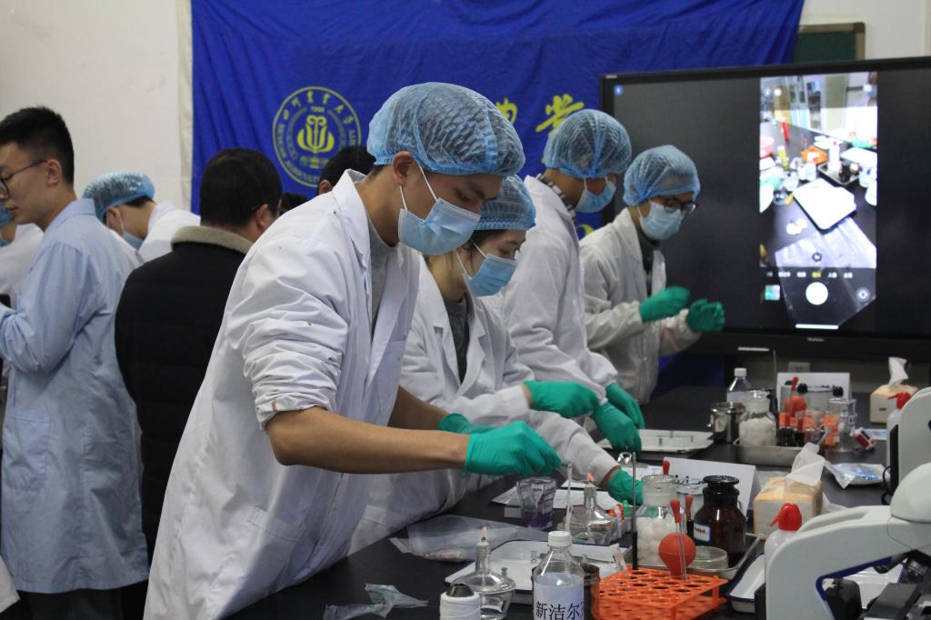 赛后副教授文翼平总结道,在教学中很多未体现出来的问题,在比赛实验操作中暴露了出来,同时为以后的教学提供了经验,以后的教学只会越来越好。同时文翼平就选手们在比赛中的实际操作强调:无菌操作的意识要始终贯穿整个实验中。比如小鼠解剖板要从中间开始,一圈一圈无交叉消毒,小鼠固定后,小鼠腹部也要这样消毒,剖开皮后这个部位还要消一遍毒,取肝前要用酒精灯过一遍手术刀,再用手术刀在肝表面过一遍。