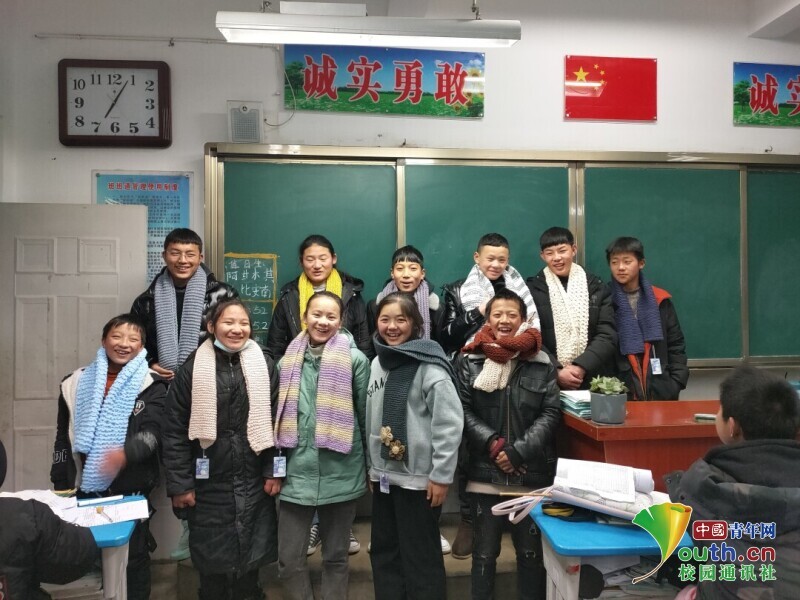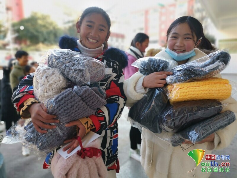 图为孩子们怀抱志愿者们手织的围巾中国青年网通讯员 袁雨 摄