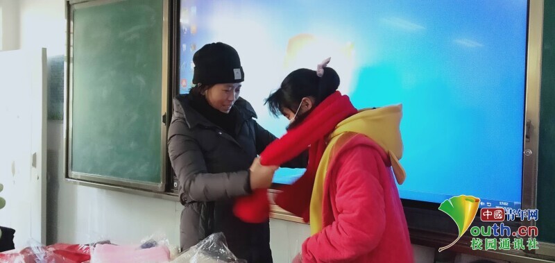 图为雷波民族中学的老师为孩子们佩戴上温暖的围巾中国青年网通讯员 袁雨 摄