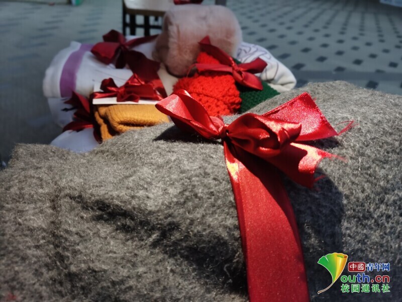 图为募捐得到的围巾、手套、帽子等保暖物品,志愿者们用红丝带包扎成礼物送给凉山的孩子 中国青年网通讯员 张嘉博 摄