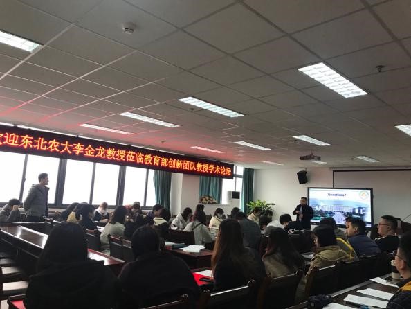 报告与上午9:30准时开始,首先由徐志文教授向同学们介绍李金龙教授,然后李教授从生猪肠道结构与功能、肠道健康概念的背景及提出、肠道健康在维持生猪健康中的作用、植物精油在改善生猪肠道健康中的作用、复合植物精油在养猪生产应用初探等五个方面进行了分享。