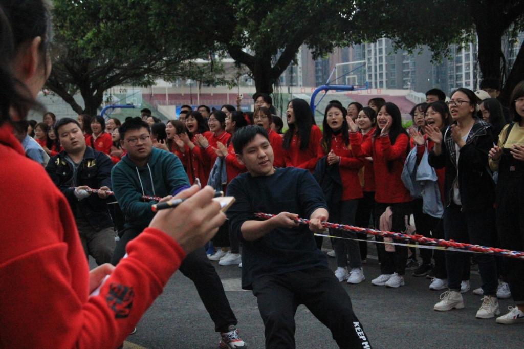 比赛当天,两支队伍都提前到达场地进行赛前准备。两只拔河队伍蓄势待发,旁边的啦啦队成员已排好队形与各院前来观赛的学子一起准备为拔河队伍加油助威。随着裁判的第一声哨响,动医啦啦队响起热烈掌声为拔河队伍打气,拔河队成员将绳子放在脚上准备蓄力。裁判第二声哨响,拔河比赛正式拉开帷幕,动医院方向“咚——”“咚——”鼓声擂擂扣人心弦。啦啦队成员踩着鼓声节奏喊起“一二一二”的口号,喊声响彻云霄。为自己而战更为公司的荣誉而战,动医拔河队员拼尽全力将绳子向自己方拽动,后排男生几经倒地。赛场上队员们个个斗志昂扬,用他们的汗水诠释了团结的意义。随着绳子不断向自己方移动,动医拔河队员愈战愈勇,手紧紧握着绳子,个个身子都向后倾斜。啦啦队成员更是放开喉咙喊口号。在响亮而有节奏的加油助威声中,拔河队成员一鼓作气将绳子拉到自己队伍方向来,取得了第一轮比赛的胜利。在接下来的第二轮比赛中,拔河队成员更是士气高涨乘胜追击,接连取得了两轮比赛的胜利。随着裁判的哨响宣布比赛的结束,动医拔河队成员激动地相互拥抱庆祝比赛的胜利,旁边的啦啦队成员和观赛群众也都扬起笑容,场面热烈了起来。