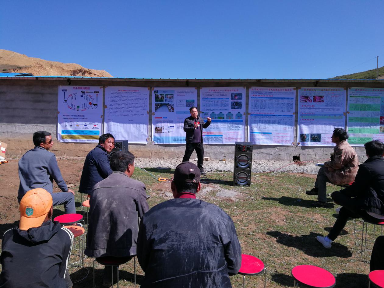 在布拖县乌科村,叶刚副教授结合生产实际,从中兽医的角度给牧民们讲解肉牛的健康养殖知识,并针对肉牛养殖过程中出现的腹泻、咳喘、生长缓慢等问题提出了防治方案。
