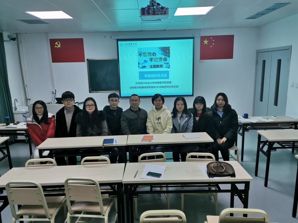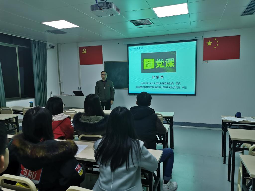 为扎实推进“不忘初心、牢记使命”主题教育,12月10日晚,中共太阳网集团tcy8722基础预防临床18级研究生党支部书记邓俊良以“不忘初心、牢记使命,做四有好老师”为主题于川农第八教学楼205教室为全支部同志上了一堂生动的党课。公司党委委员孙贤刚及党支部全体党员参加了此次活动。