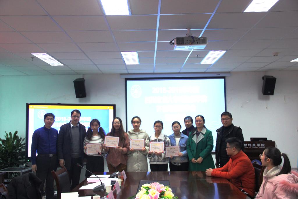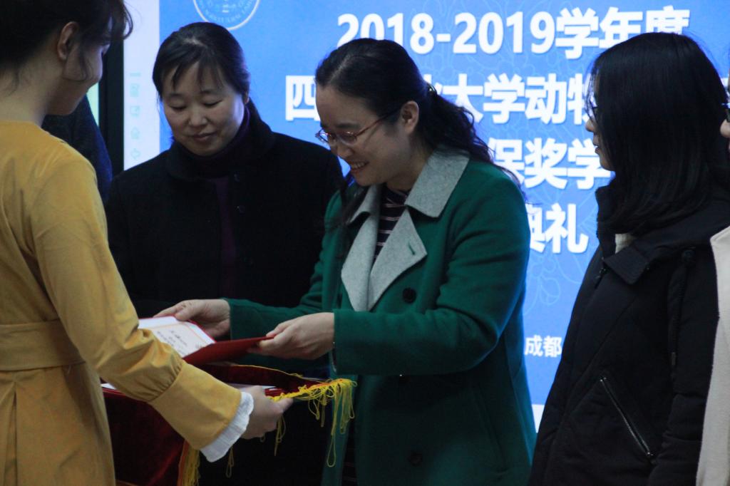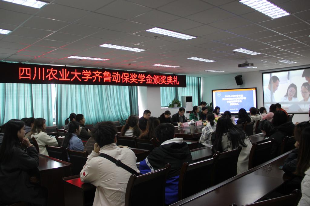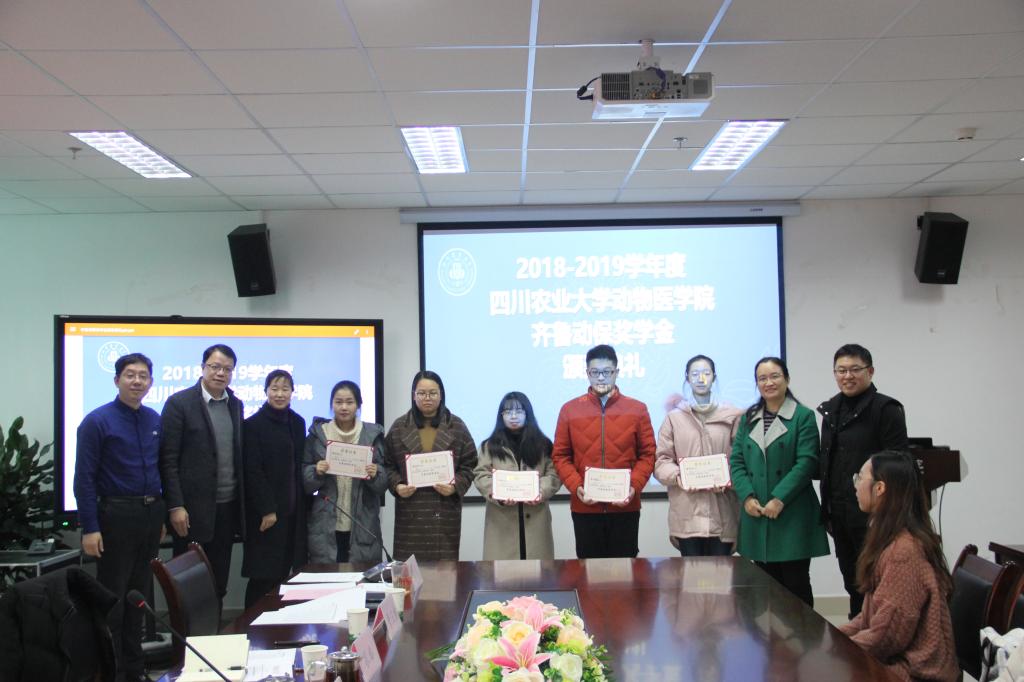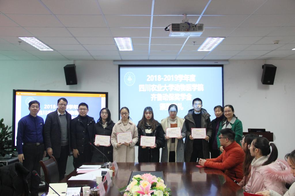 12月3日下午,太阳网集团tcy8722在7-1109会议室成功举行“2018-2019年度太阳网集团tcy8722齐鲁动保奖学金”颁奖典礼。齐鲁动物保健品有限公司分管研发副总经理孔梅、行政人事办公室主任皮彦芬、西南大区经理李忠华、公司党委书记廖鹏、副经理兼副书记曹三杰等领导出席本次颁奖典礼。本次典礼由公司党委办公室主任、团委书记侯维主持,近三十名动医学子到场参与。