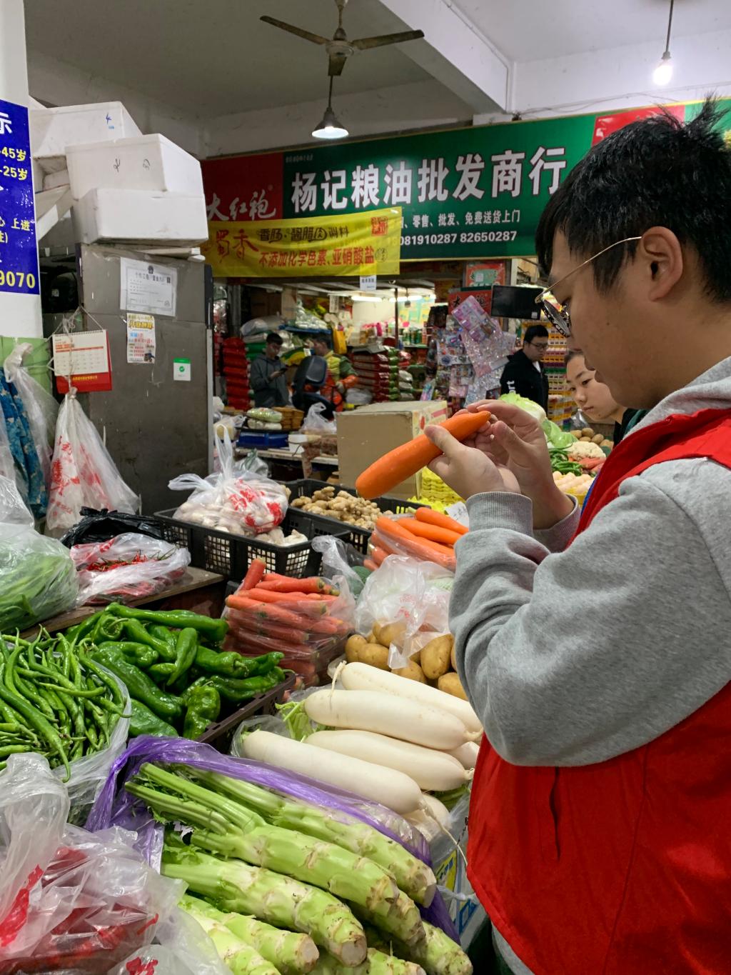 11月24日,清晨七点,天色未亮,蒙蒙细雨中,在校园附近的菜市场中,一群“红马褂”出没,吸引了不少摊贩的注意。“阿姨,这个胡萝卜脆吗?”“老板,这韭菜怎么卖啊?”……忙碌着采购食材的正是身穿红色志愿者服的22名动医学子,他们正按照计划,开启一天的“秘密行动”。