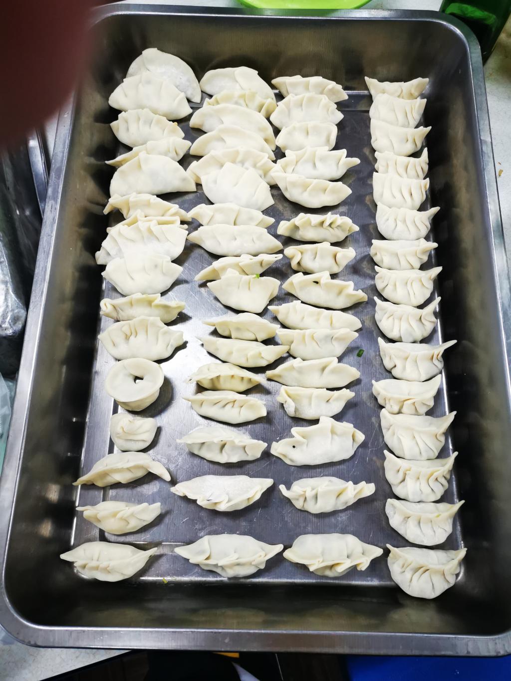 洗菜、切菜、剁肉、和面、配料……上午的食堂一隅可谓“热火朝天”,在食堂面食窗口的工作人员指导下,志愿者们将购买回来的食材分小组,依次分工处理。满满一大盆馅料准备好后,放馅、折褶子,最后捏合两边,一个圆滚滚的白皮饺子便在志愿者手中“诞生”。“你看我的饺子!”“我这个才好!”……饺子组成员互相“攀比”,制作间里满是欢声笑语。看着圆鼓鼓的饺子,饺子组组长笑着说:“饺子里装的不仅仅是馅料,更是我们对保安大叔和宿管阿姨的感谢与美好祝愿。”说话间,一个“胖”饺子就在他手中完成。一名北方员工说:“我从小吃的都是蘸饺,也很想让叔叔、阿姨们尝尝东北蘸饺,但因为天气太冷,我们煮的汤饺,希望他们能吃到热腾腾的饺子。”