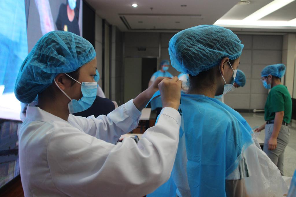 临床实验操作环节,每个团队的3名成员需要协力合作,在10分钟内完成“术前准备”、“皮肤结节缝合”、“术后检查护理”等环节的考核和比拼。专家评委根据各队操作的规范程度、精准程度、完成速度以及无菌意识等进行评分。