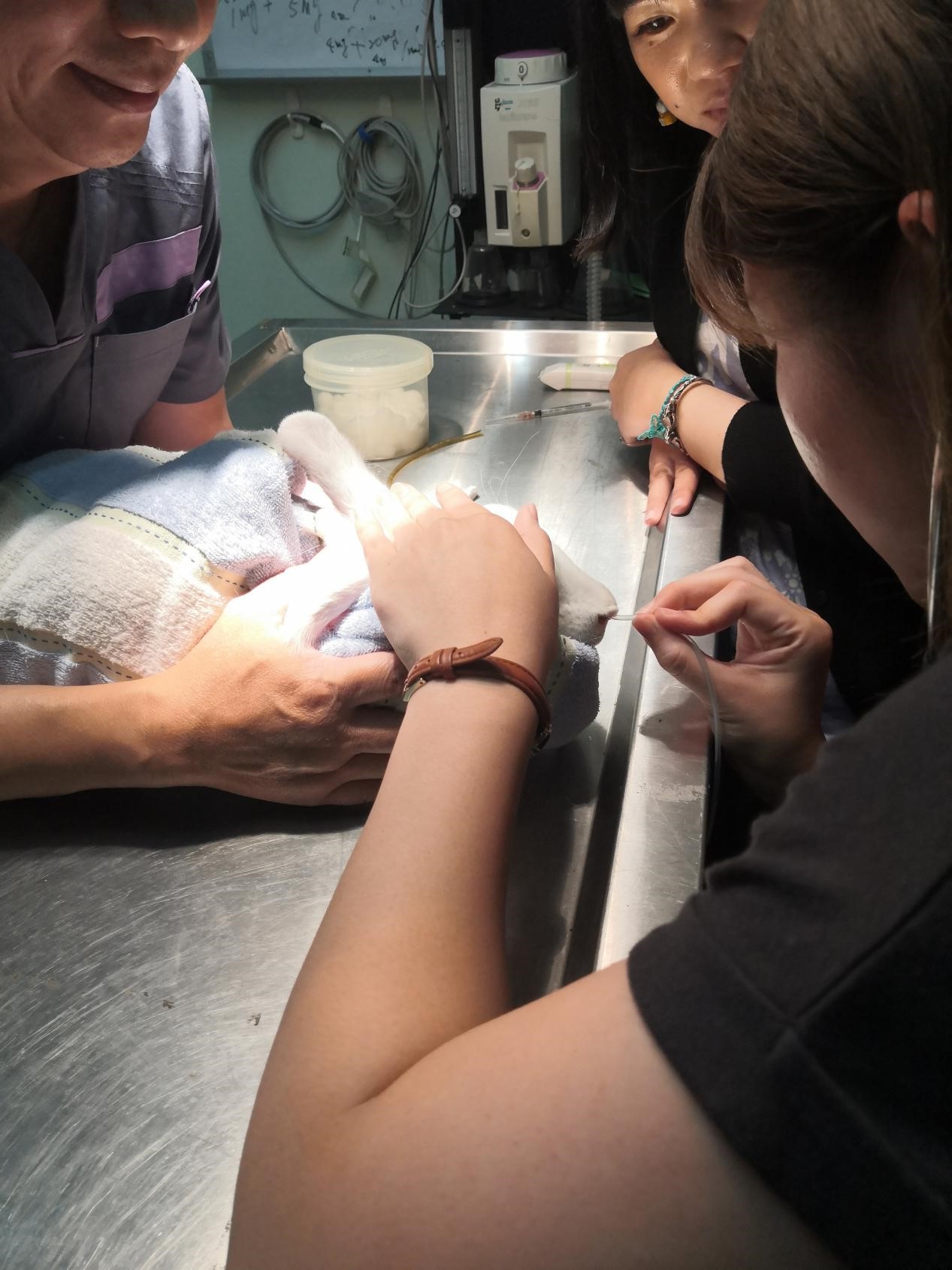 李燕和唐倩莹刚刚抵达中兴大学,在简短而隆重的见面会后,紧张充实的学习课程便立即开启。中兴大学的教授专家老师们从实习的第一刻的全英文教学,就让两位川农学子真切感受到加强外语学习与交流应用的重要。经过简洁的整体培训后,员工们进驻中兴大学教学动物医院,在各科室轮岗实践,通过理论结合实操培训,学习心脏病学、影像科学、眼科学、异宠学、内科学、皮肤病学等相关临床知识。此外,还在老师的带领下,进入神经解剖组织学实验室、病理学实验室、水生动物实验室等学习基础兽医知识的应用。