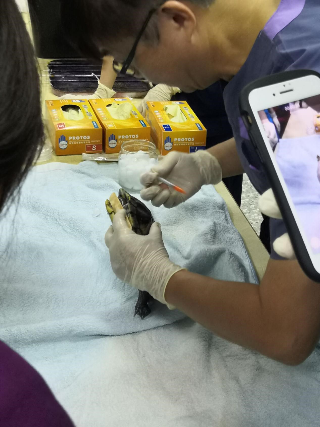 除了临床实践学习,项目期间还有不少英文讲座,拓展了动医学子的思维,加强了专业英语的学习。有Yamato教授讲授“犬老年病”相关知识;中兴大学兽医系的各科老师讲授家禽类疾病、鸟类知识、马类疾病、兽医微生物学、病毒学知识、心脏学等等;台湾嘉义大学兽医院经理詹昆卫教授讲授中兽医学等;同时还有朱哲助医师讲授异宠相关知识。让同学们印象比较深的是中兴大学董光中教授的异宠实践课,在这里实习生们学会了如何给巴西龟和花龟采血、血涂片、血液分析,如何巧妙的给兔子进行气管插管、鼻胃管插管、泪管给药等操作技巧。