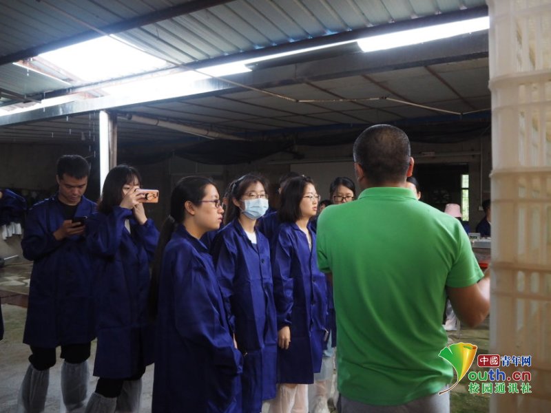 图为队员拜访“公司+农户”模式下的种鸡场。中国青年网通讯员 黄秉洲 摄