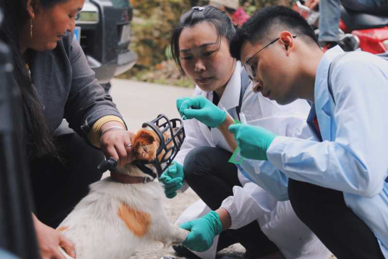 活动期间,4位大四的毕业生党员跟随基地专家和保护区专职干部穿越上千公里山路,在保护区挨家挨户发放犬类传染病防控知识宣传折页与海报,介绍犬瘟热、狂犬病等烈性人畜共患病预防措施,认真讲解科学文明养犬等相关的科普知识,开展相关基底调查、收集整理关键数据。同时,积极发挥自己所学知识和专业技能,规范高效地协助团队专家完成了对约300只家犬的疫苗接种、疾病检测、犬只信息详记以及粪样采集等多项工作。踏实勤恳又年轻专业的动医学子“跑得快”、“有亲和力”、“不怕苦”,很好地提升了活动成效,赢得了专家队友和当地民众的一致好评。