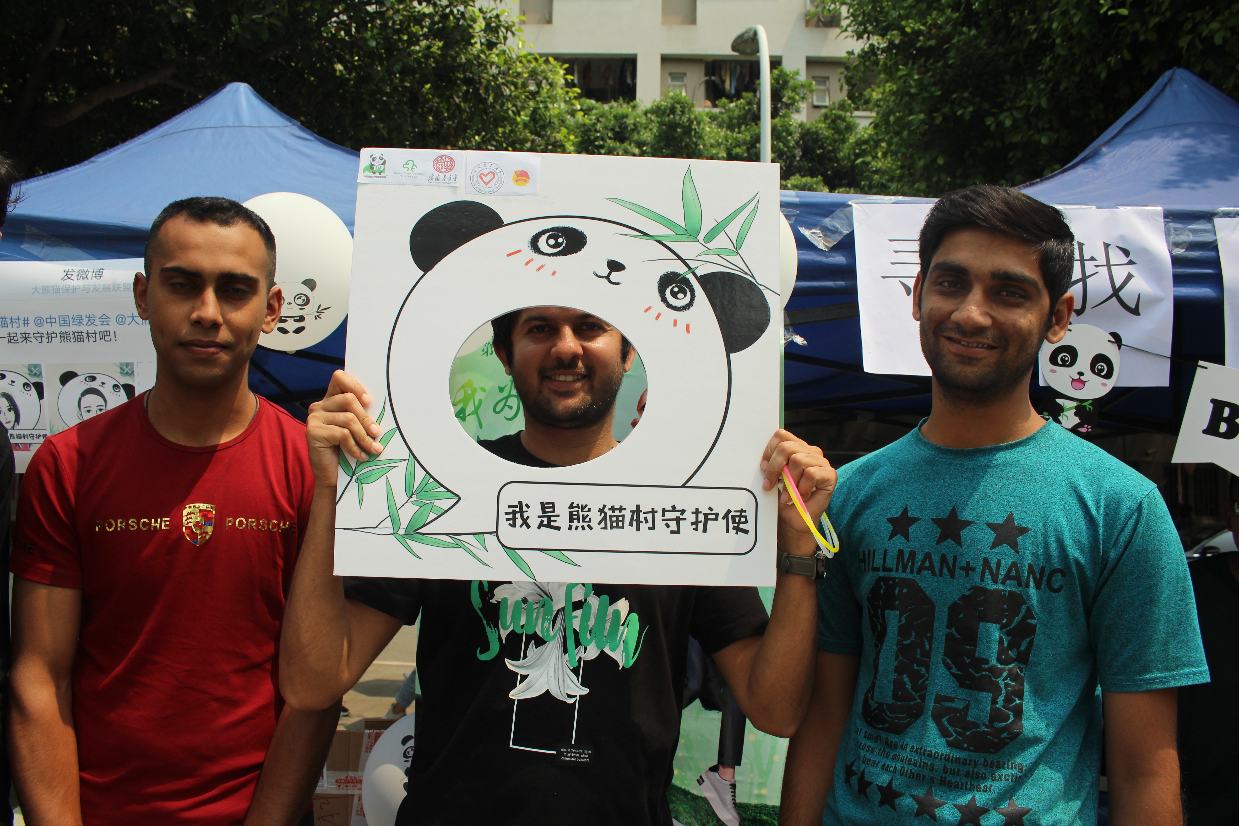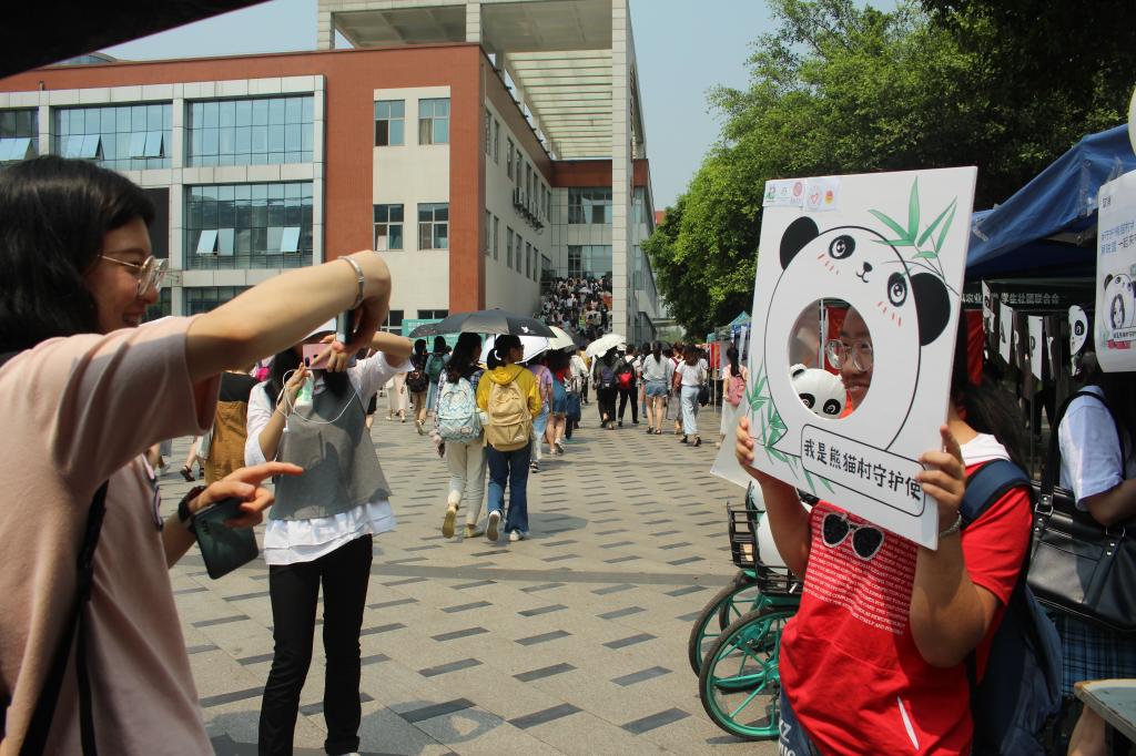 “第一只‘留洋’美国的大熊猫幼仔叫什么名字?”“大熊猫会不会冬眠?”“大熊猫的祖先是什么动物?”伴随着“熊猫小知识”趣味竞答活动的顺利开展,咨询报名参选“熊猫村守护使”的同学也越来越多。而在中午时分,陆续有同学将自己的合影带上#守护熊猫村#话题发布微博,这一举动更是将活动推向了高潮。各大校园媒体也纷纷报道了此次校园“熊猫热”,称其“公益味十足”。