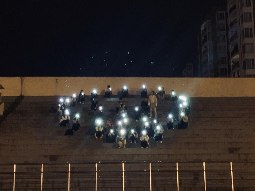 除了个人的行动,有不少同学还积极参与到活动的现场宣传中。他们十数人或几十人集合在一起,打开手机照明,在操场上围成“灯泡”、“爱心”等图案,并在“灯芯”在指令下有节奏地定时熄灭手机灯,宣传“熄灯一小时,为地球节能”的活动主题。巨大灯泡、爱心的一开一关,引得路过的师生驻足观看和点赞。