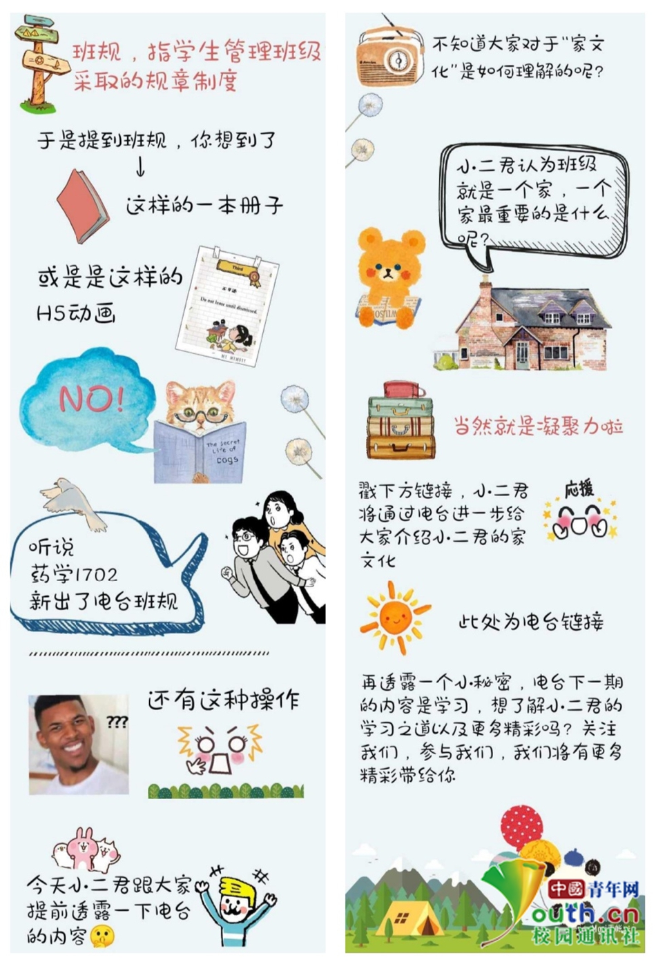 3月23 日,《药小二的电台》第一期节目在网上播出。“一家人就是要团聚在一起、谈天说地在一起、努力进步在一起。只有在一起的我们,才是班规的开始,才是家文化的开始。”该班主播阿舟、Jenny收集分享了许多班级小伙伴对“家文化”的深刻理解与建设性意见。该班同学杨雨(化名)来信:“家文化就是班级成员发自内心愿意为班级建设,以班级优先的态度。是各自成员交流无隐晦,各成员在班级自如地生活。”除了该班同学们对班规的建议之外,还有来自同学刘钰精心雕琢的关于药小二这个虚拟人物与同学们之间的温情故事的投稿。网友@骨骼线条粗大少女说:“晚上听着和自己班有关的事情睡觉肯定很有趣,我先干了这杯柠檬汁。”