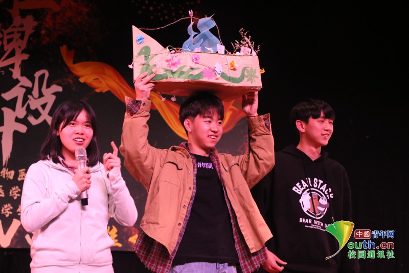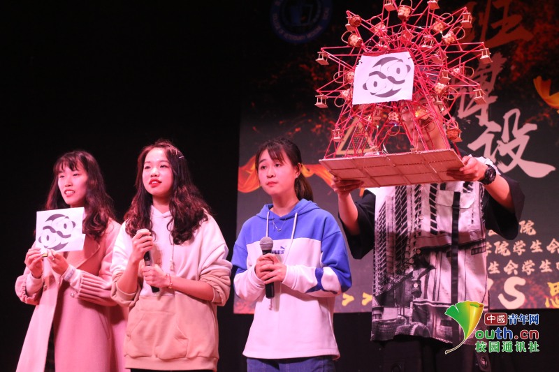以诺亚方舟为原型,挂上团旗、院旗和班旗,这件班牌寓意着这个小班将在共青团的指引下,以公司和班级为载体,怀揣梦想,克服困难,驶向光明的未来。现场解释班牌设计内涵的同学妙语连珠,评委老师们不断称好。中国青年网通讯员 张玉 摄