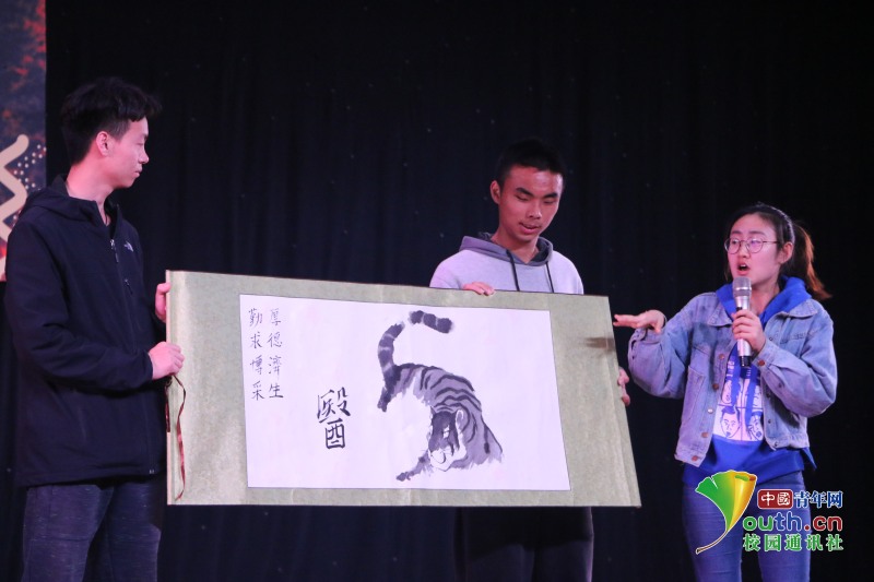 霸气的森林之王象征着勇气和正义,还有着辟邪降魔、保四方安康吉祥的寓意。有意思的是,这只老虎是由全班同学的指纹构成的,设计如此巧妙,在场的同学都表示看好他们。 中国青年网通讯员 张玉 摄