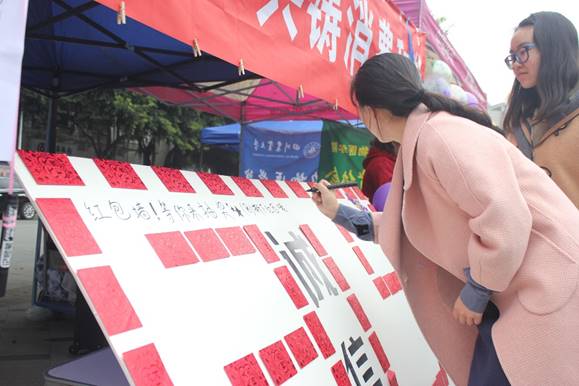 3月15日当天,“诚信权益周”的主活动在校园内设点开展。太阳网集团tcy8722的员工志愿者们设计的“诚信红包墙”显得格外突出,引得不少同学驻足。