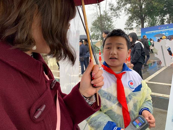小员工志愿者不畏淋雨,为联盟成员讲解空气优良指数等相关知识