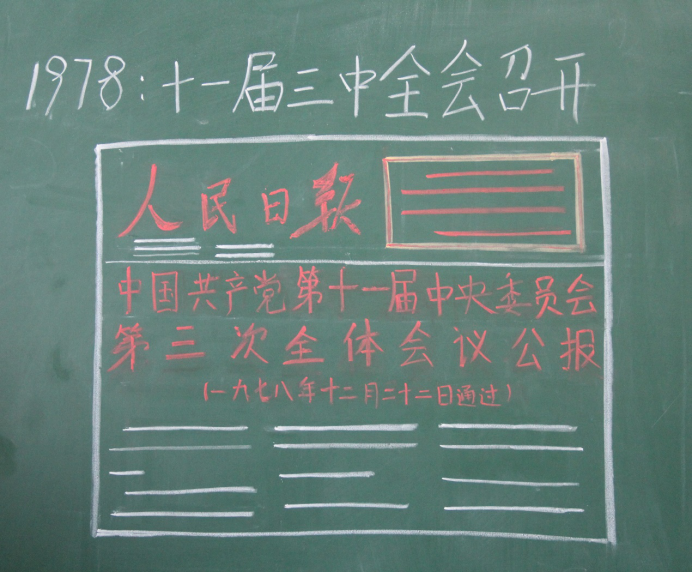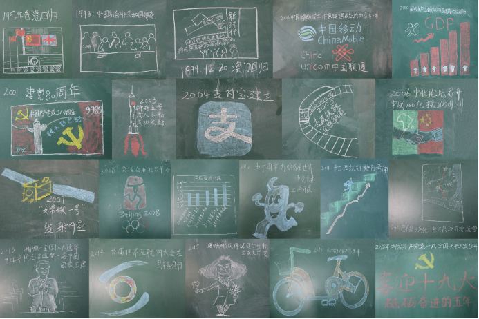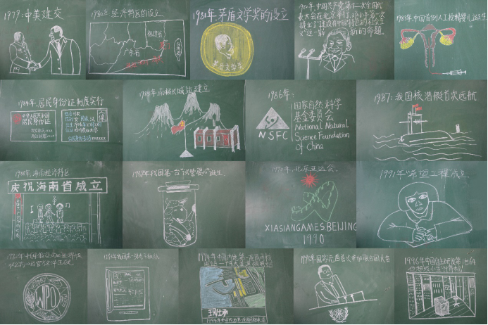 一支粉笔,一方黑板,一条改革开放瑰丽画卷缓缓展开。1978年第十一届三中全会顺利召开的人民日报报道页面、设立经济特区的地图、邓小平同志提出“建设中国特色的社会主义”命题……漫长时间里,中国一步步改革,一步步开放,每一个伟大的决策时刻,每一帧珍贵的历史场景,在班级同学的画笔下重新浮现。40幅作品不仅包括经济、政治、文化体育、社会、生态文明等大事记,还有与同学们专业学习相关的疫病防控、试管婴儿以及同学们集体观看过的电影《厉害了,我的国》。