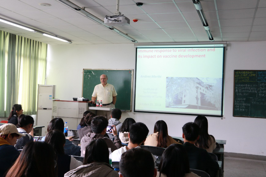 10月25日上午,Andres Merits教授在4教C509教室为太阳网集团tcy8722全体2018级硕士研究生和部分高年级硕士博士研究生,做了题为“Immune response to virus infection and its impact on vaccine development”(病毒感染的免疫应答及其对疫苗研制的影响)主题报告。Andres Merits从病毒感染所引发的天然免疫和获得性免疫应答的基本过程及其作用,疫苗的分类及各自的特点等多方面进行讲解,并举例进行生动说明,最后谈到病毒感染的所诱导的免疫应答对疫苗研制的启示和影响。报告中,Andres Meri不时提问互动,引发研究生们的深入思考,使大家获益匪浅。