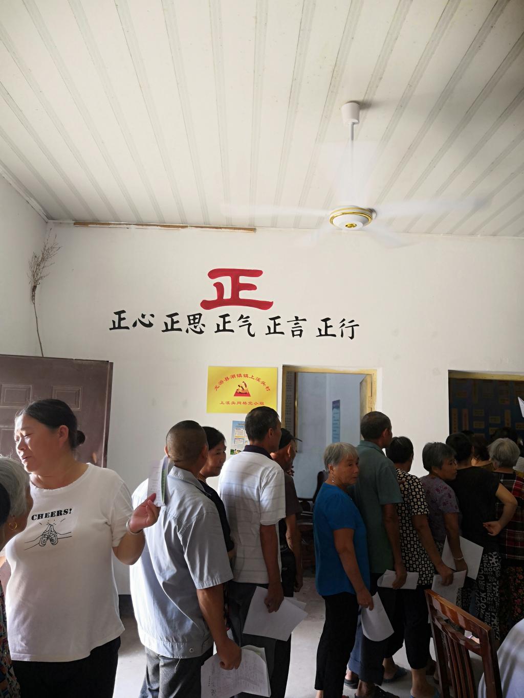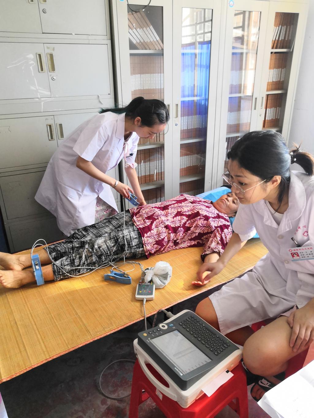村民们拿着体检单有序地排队等候体检。队员邹远鹏帮助一位不识字的老人进行基本信息的登记。 测量身高和体重是义诊的第一个环节。队员们协助测量的医生记录所测数据、仔细准备抽血所需的医疗用品、用尿常规试纸给村民们检查尿常规。他们的细心工作换来义诊有条不紊地进行。一位负责抽血的医生在每次抽血结束后,都不忘提醒老人们要按满五分钟止血。“许多老人医学常识不够,我们往往要嘱咐很多次他们才记得住。”医生向队员解释给老人义诊的注意事项。队员陈倩在医生的指导下为老人检查心电图。她在检查中谨记医院培训时所教的方法和注意事项:左右手对应不同电极,不能将夹子触碰到衣物和金银首饰。 一位老奶奶得知血压测量结果正常,要继续保持时,露出开怀的笑容。“有时候他们就像孩子,对自己的健康十分重视。”队员对老奶奶的笑容记忆深刻。