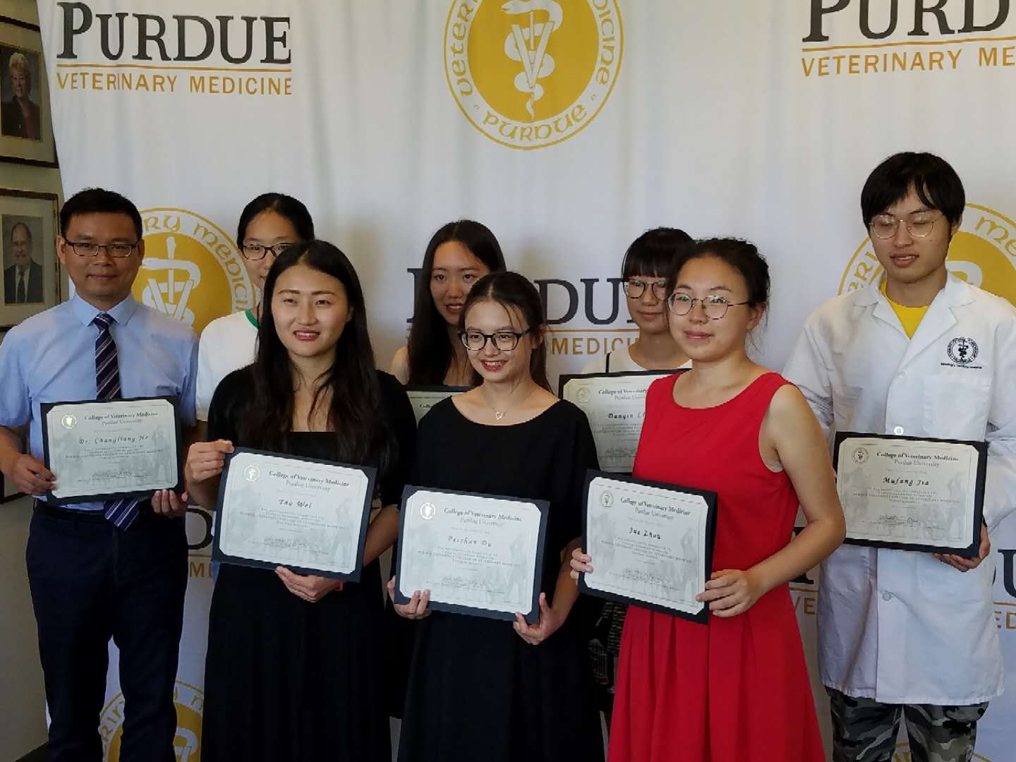 结业典礼上,普渡大学兽医公司经理Dr. Reed教授高度评价了此次实习的成果,对师生们顺利完成实习任务表示祝贺,亲自为每一位实习生颁发结业证书,并和同学们合影留念。