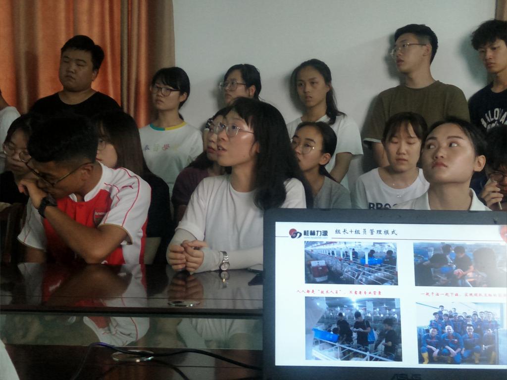 在参观交流过程中,种猪厂管理人员向实践队员简要讲述了种猪厂的构造、运行情况及养殖市场需求情况。“种猪厂采取了‘公司+家庭农场’的新型生态环保养猪模式,布局合理,注重环境,贯彻可持续发展理念。”负责人还表示,养殖场采用了美国GSI公司智能环境控制系统和自动饲喂系统,管理模式则采取“卡美托管”模式,与国际先进水平接轨,且年供商品仔猪可达15万头。对于同学们提出的“市场饱和”“成本高昂”等问题,负责人也细致解答,“养殖市场到目前为止,仍然处于供不应求的不饱和状态;而成本高昂则是相对性的,分配于每头仔猪来看,成本其实还是不高的,将来品牌猪肉会越来越受到追捧。”随着人们生活水平的逐步提高,人们对食品安全的重视程度越来越高,健康无污染的猪肉也会水涨船高。高科技养猪成为了发展趋势,养殖培育都需要专业人才,未来较长一段时间内养殖业将会呈现出很大的就业容量。
