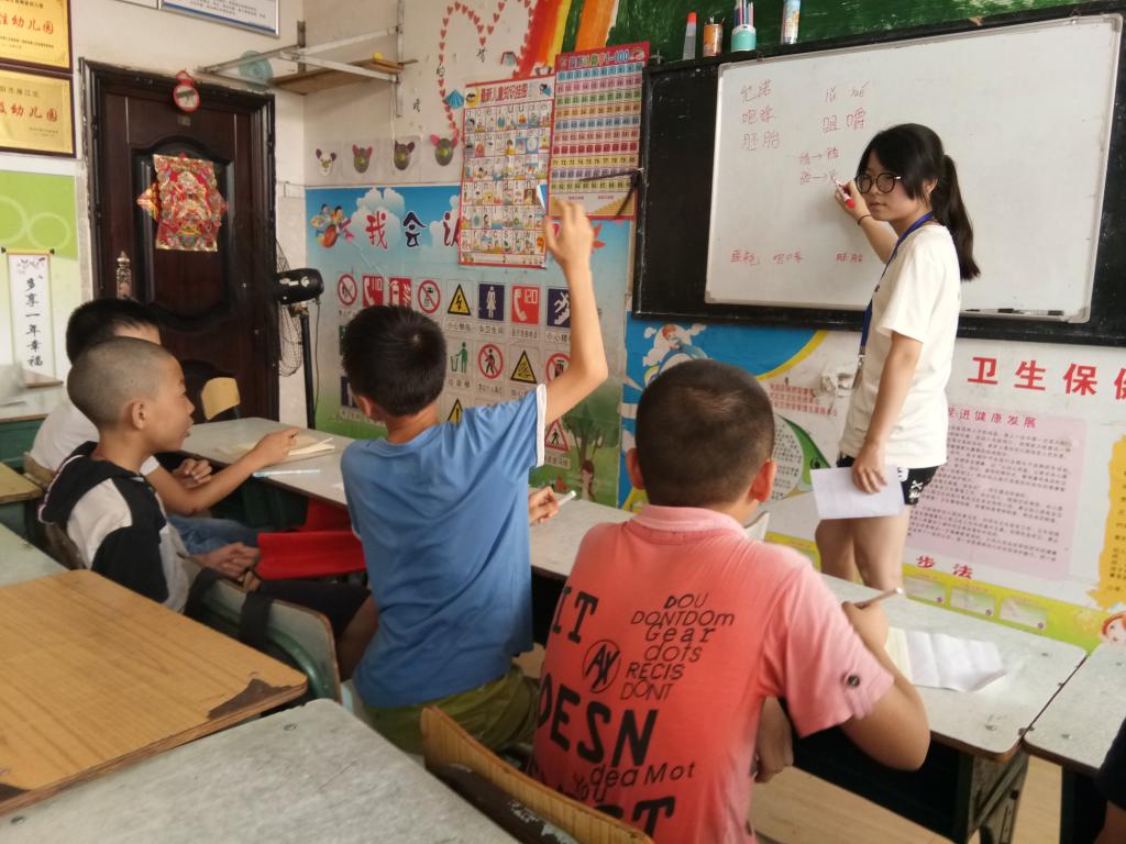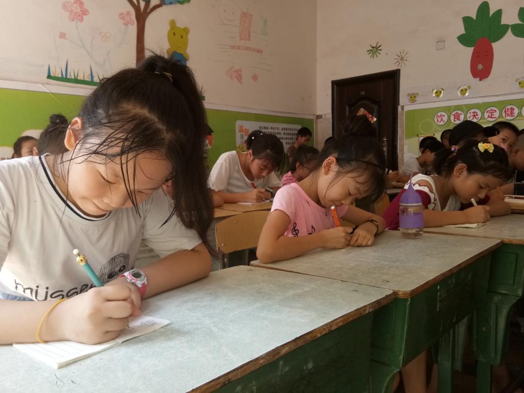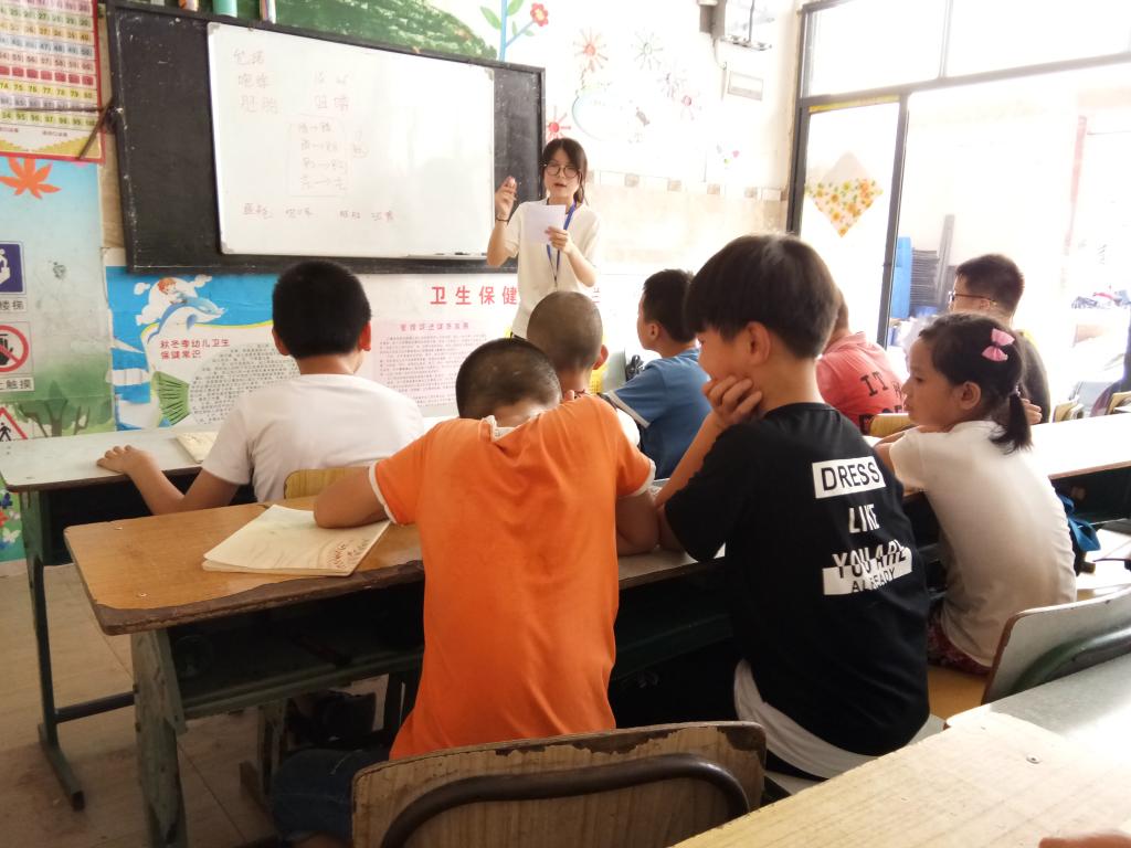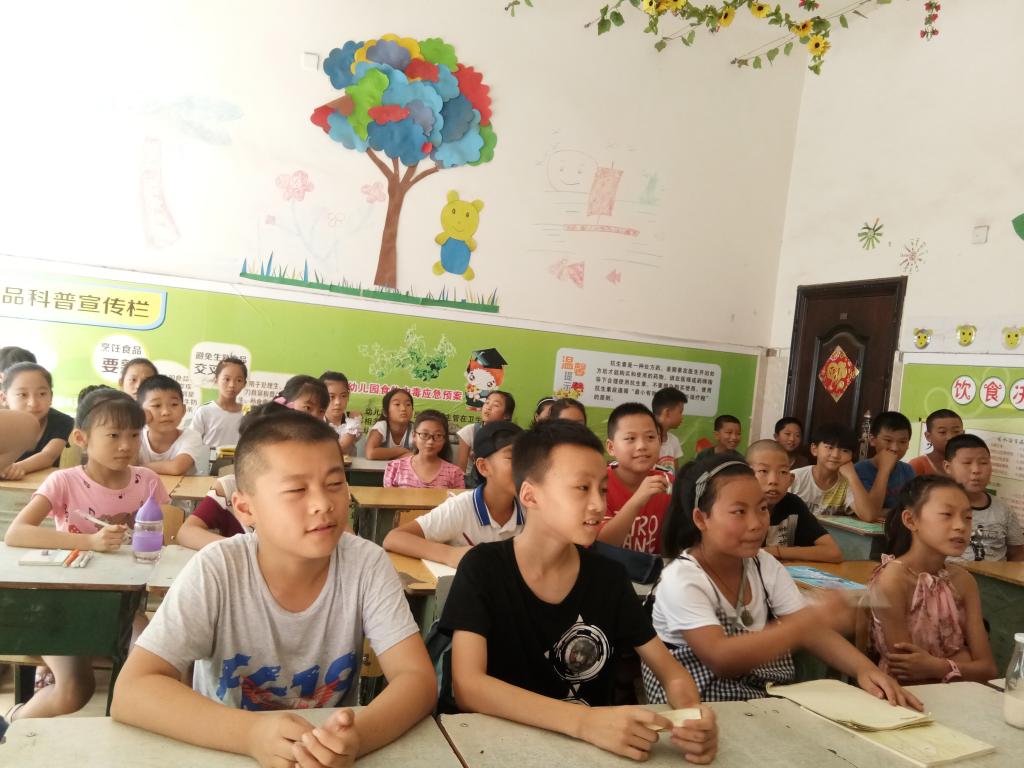 场地限制、天气炎热,也阻挡不了孩子们对夏令营活动的热情。因排课和器械搬运问题,开课第一天下午没有安排上课,但依然有员工顶着炎炎烈日赶到志愿者的住处。7月25日,当地室外最高气温达37℃,在幼儿园的无窗教室内,四、五年级孩子们依旧跟随志愿者坚持上完了六个小时的课程。孩子们满头大汗、志愿者和老师们也汗流浃背,“热是肯定的嘛,但看到他们听课的表情,就觉得很有动力。”五年级语文老师周能华说道。