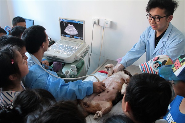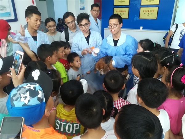 在实验室实习的同学用简单易懂的话语向小朋友们讲解了狗狗B超技术的原理,并进行了展示,第一次看到活体内脏器官的孩子们十分好奇,连连追问“为什么我看不出来这是什么!”动医1501班的李财源同学对小朋友们说:“你们现在好好学习,有了知识就会知道为什么了。”随后进行了雾化展示,并让小朋友们亲自感受实践。