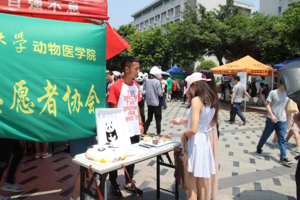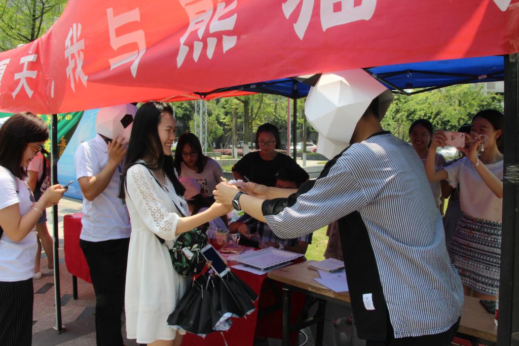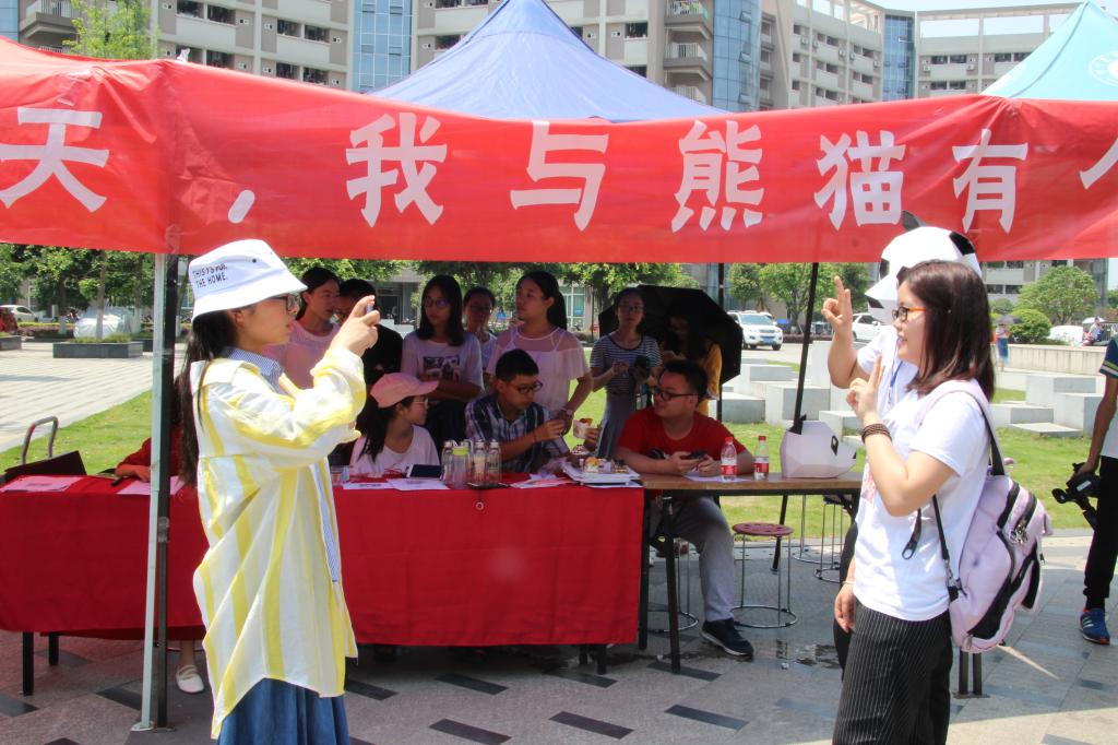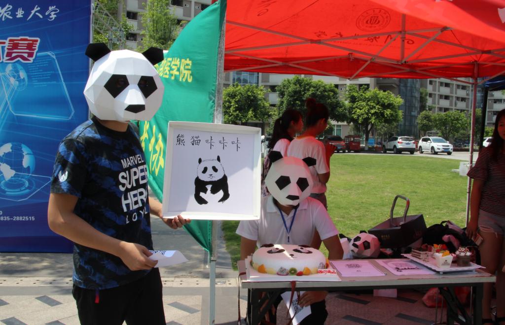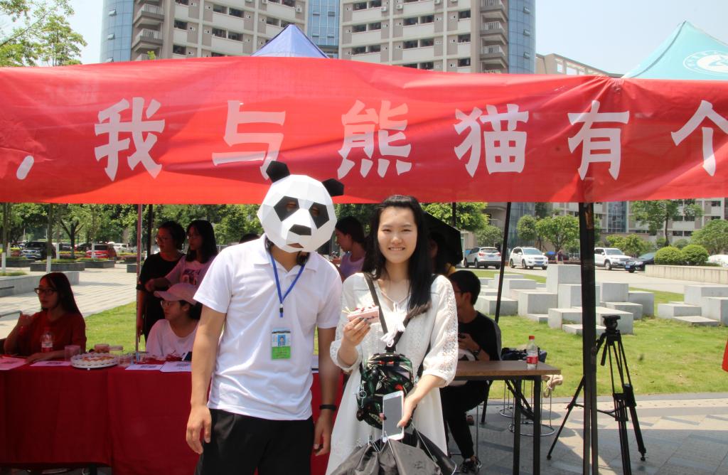 设点宣传时,通过回答趣味科普问题而赢得蛋糕吸引同学们积极了解并参与活动,“中国古代哪个朝代把两只大熊猫作为国礼送给了日本?大熊猫有几个手指?大熊猫一直吃素吗?”提出的问题让同学们在欢乐中了解到更多关于大熊猫的小知识。