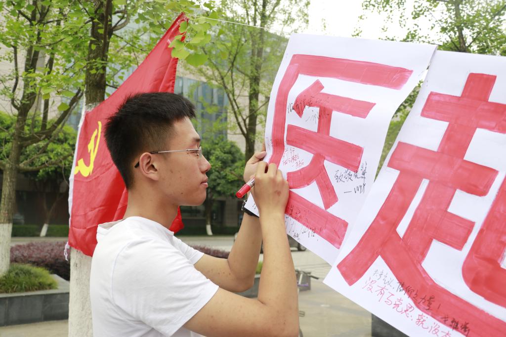 李大钊的英勇就义,陈独秀的当仁不让,闻一多的慷慨激昂……先驱们为共产主义事业奋斗的鲜活事迹历历在目,激发了同学们学习践行马克思主义和马克思主义中国化理论的热情。大家对着阳光,对着党旗,举起右手再次庄严宣读入党誓词:“我志愿加入中国共产党,拥护党的纲领,遵守党的章程,履行党员义务,执行党的决定……”宣誓完毕后,几位老党员联系新时代老员工的实际生活侃侃而谈,“有志者应当为中华之日益富强繁荣而不懈努力,自强不息。”所有参与成员主动在活动横幅下写下心得感悟,籍此表达对马克思的敬意。