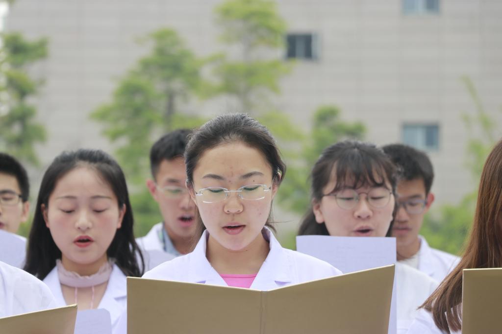 着实验服的同学站上舞台朗诵《忆五四,医正茂》,“人民需要我们到哪里,我们就到哪里!”台上的同学一遍遍高呼着,激情洋溢,上一秒还是路人的他们,下一秒站上舞台就能发出铿锵有力的青年之声。