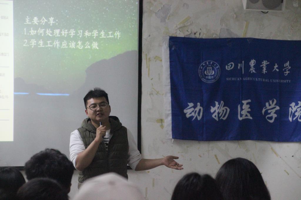 而后每位分享人均结合自己的实际,各有侧重地分享了自己学习工作中的一些所思所感所得。杨洪同学自己转专业的经历,分享了如何适应老员工活,分配时间、抓住重难点、缓解员工工作和学习的冲突;赵亚星同学则以自身经历为例,告诉大家要学会在必要时候调节自己的心态,不要患得患失,沉下心去真正提高自身能力,为更多的同学服好务。“科学研究和员工工作一样,要勇于尝试,突破自我,不怕失败。”获得“挑战杯”四川省一等奖的龚松林同学为分享了如何让学习和工作兼得。考取中国农业大学“卓越兽医师”研究生计划、获得去全国动物医学专业技能竞赛特等奖的优秀大学毕业生袁媛同学则通过互动的方式为师弟师妹解答了如何实现“做好员工工作与考研共同协调”。
