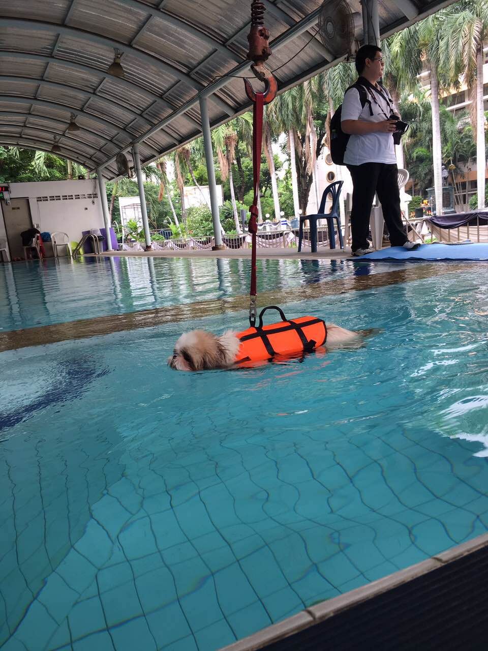 室外游泳池,宠物正被牵引着做全身康复训练