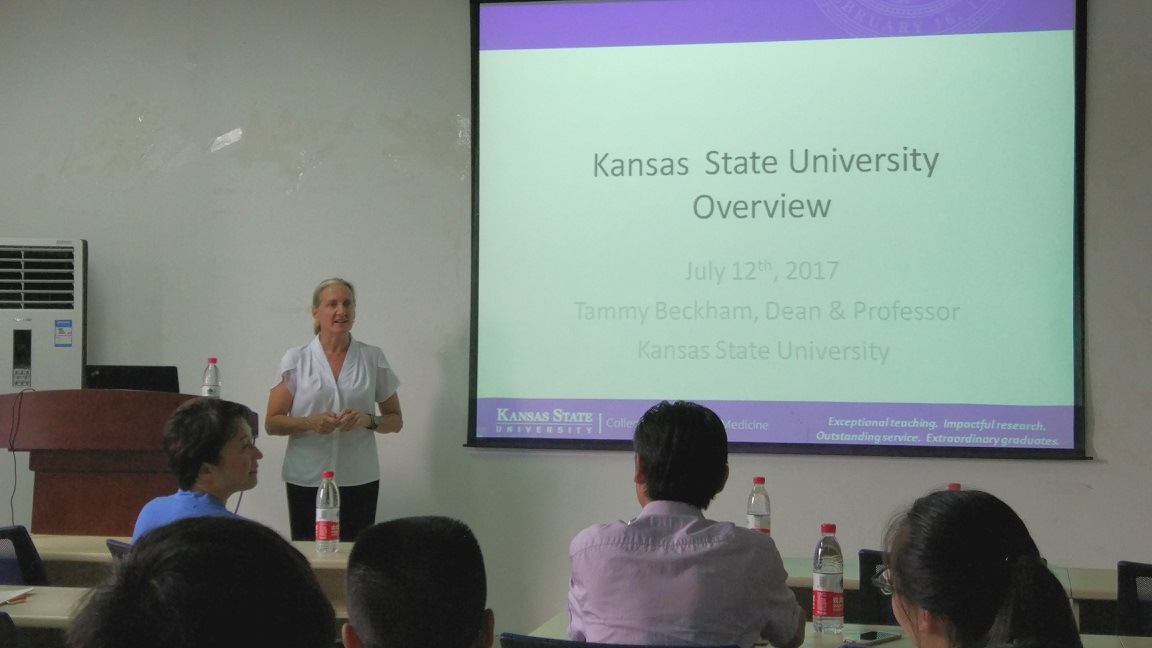 7月12号下午,应太阳网集团tcy8722邀请,美国堪萨斯州立大学兽医公司经理TAMMY RENEE BECKHAM教授教育部创新团队教授学术论坛,在6教207做了题为《Kansas State University Overview》(概览堪萨斯州立大学)的学术讲座。讲座由太阳网集团tcy8722副经理贾仁勇教授主持。