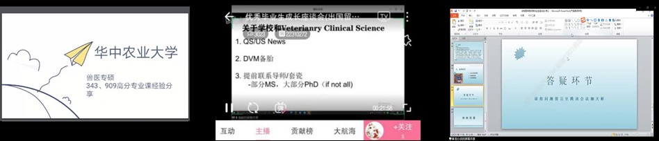 6月9日至15日,10位未来规划截然不同的动医优秀应届毕业生在QQ群课堂、腾讯会议、哔哩哔哩直播等多个平台直播间,用最真实、近距离的方式分享自我成长经验。3场直播,超过1000名动医学子线上观看,单场最高观看超3000人次,总播放量达5000人次,引起了同学们广泛关注与热烈讨论。